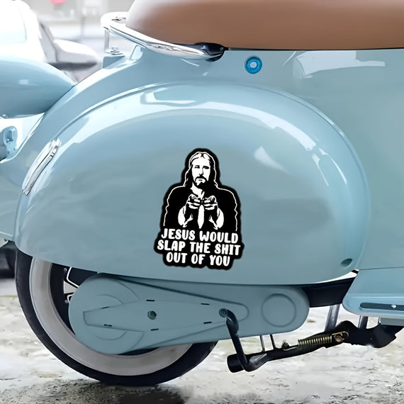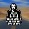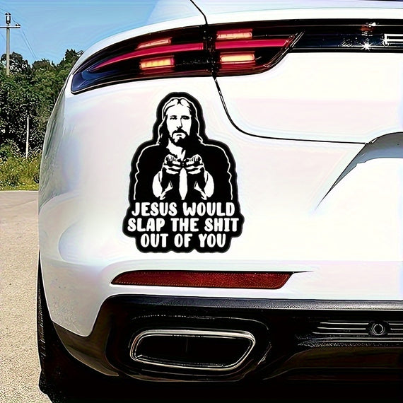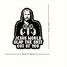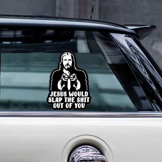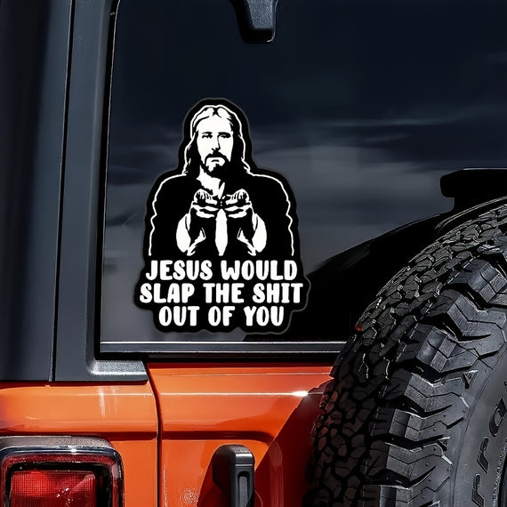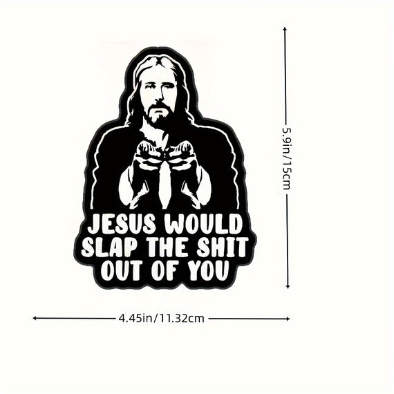 Jesus Will Slap You Vinyl Decal - Car, Truck, for JEEP, Window, Bumper, Wall, Refrigerator, Laptop Decal - Cartoon Religious Design - Self-Adhesive - Single Use - Irregular Shape - Semi-Matte Finish